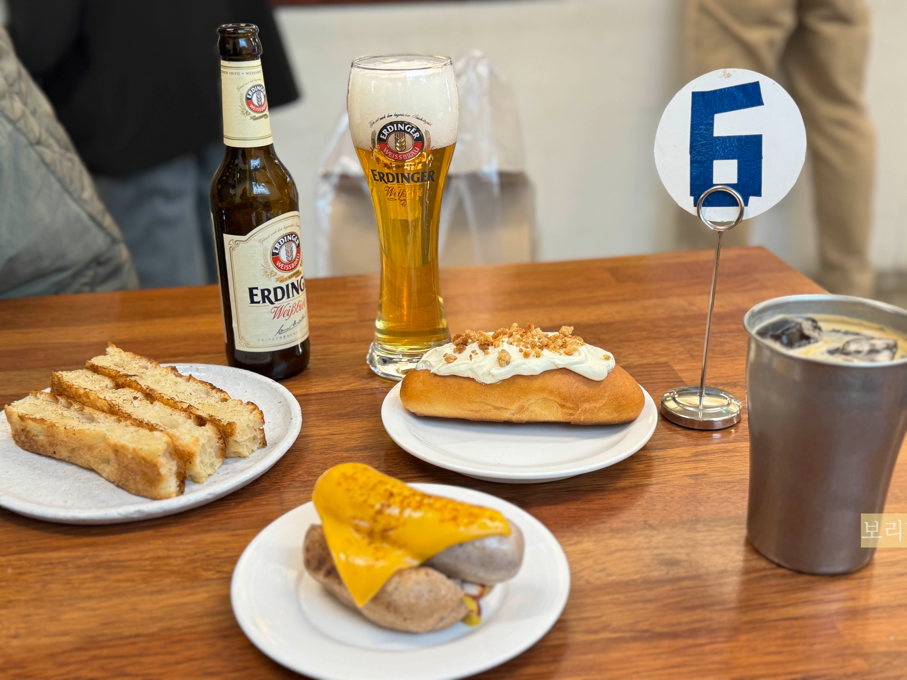 친구는 소세지가 들어간 치즈버거번에 맥주
